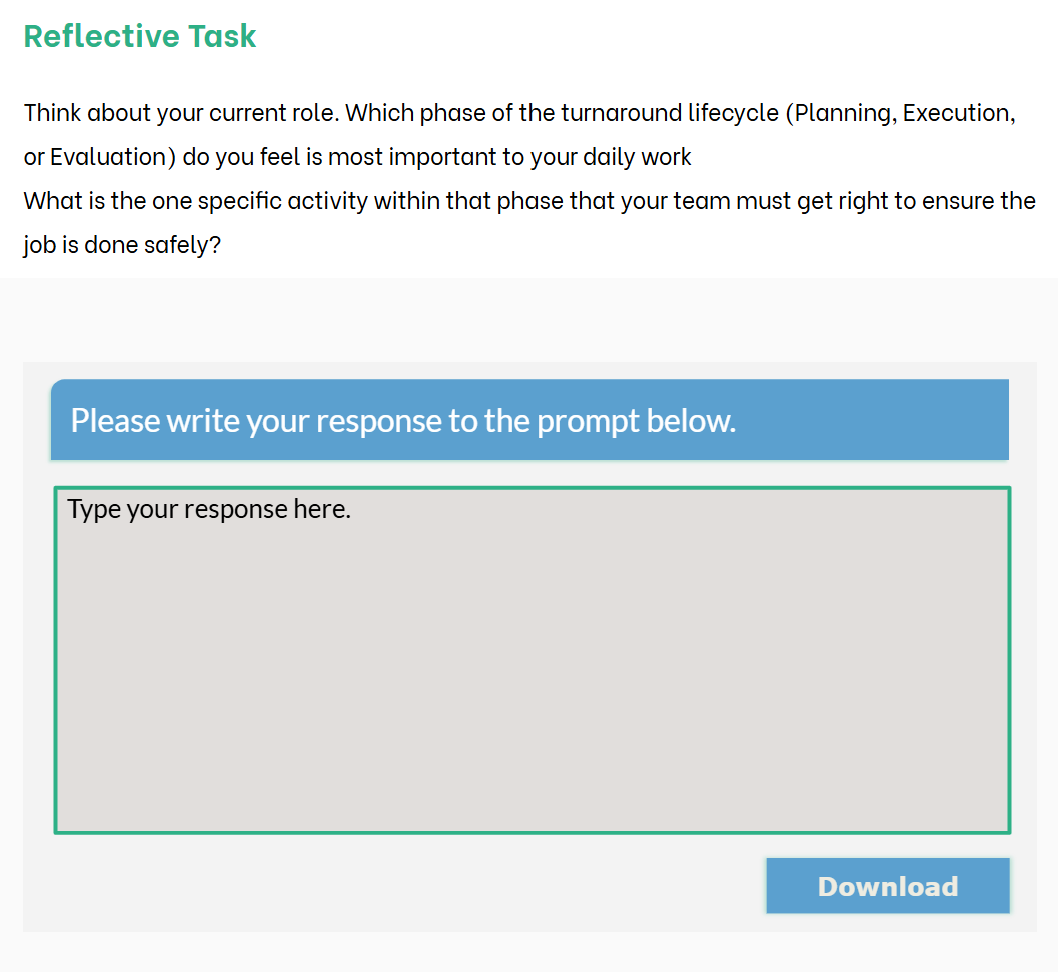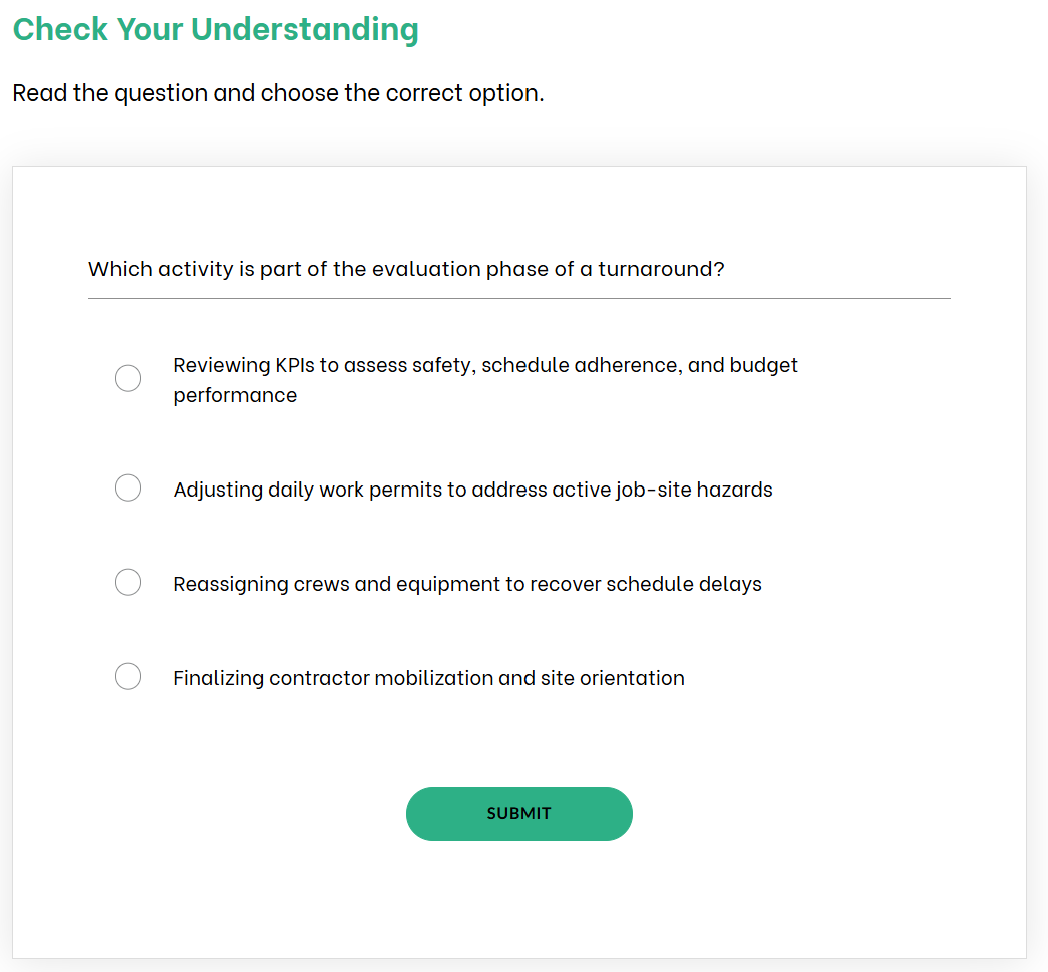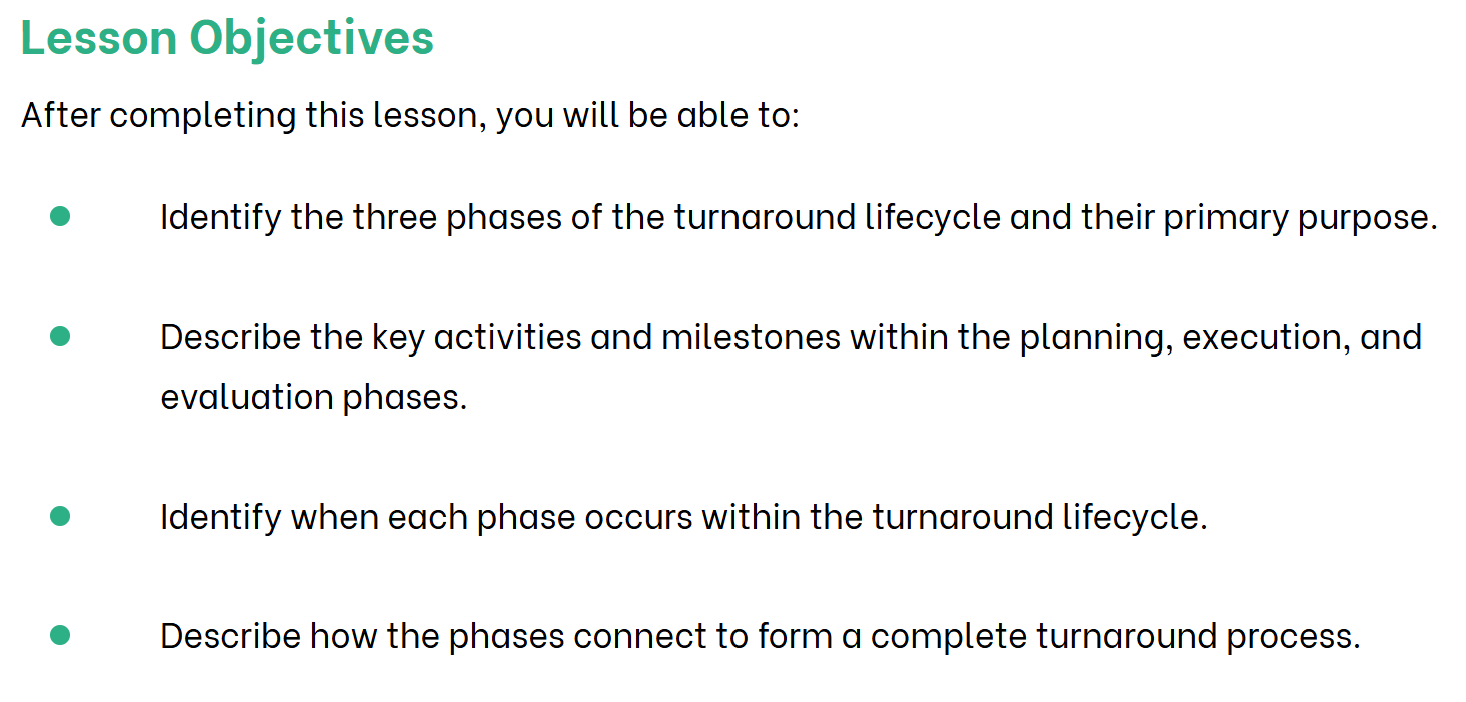 By identifying which phase is most relevant to their specific role, the training becomes practical rather than theoretical. This will encourage the learner to do more than just remember a list of phases when they return to the facility. Instead, they will view their daily tasks through the strategic lens of the entire turnaround lifecycle.