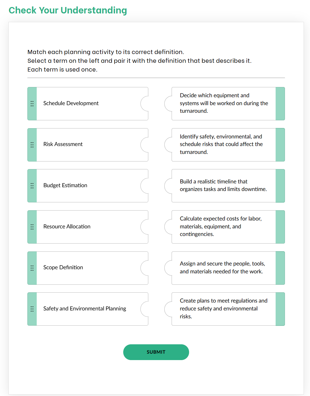 Learning works best when the environment matches the real world. This training asks learners to sort specific activities into their correct phases. For example, they might decide where adjusting work permits fits compared to reviewing KPIs.